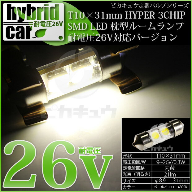 [1個]☆ハイブリッド車対応LED☆ルームランプ/ラゲッジルームランプ(ラゲージ) T10×31mm規格 [無極性タイプ]HYPER 3chip SMD LED 2連枕型ルームランプ LEDカラー:ペールイエロー[色温度:4300K] 入数:1個(2-B-1)