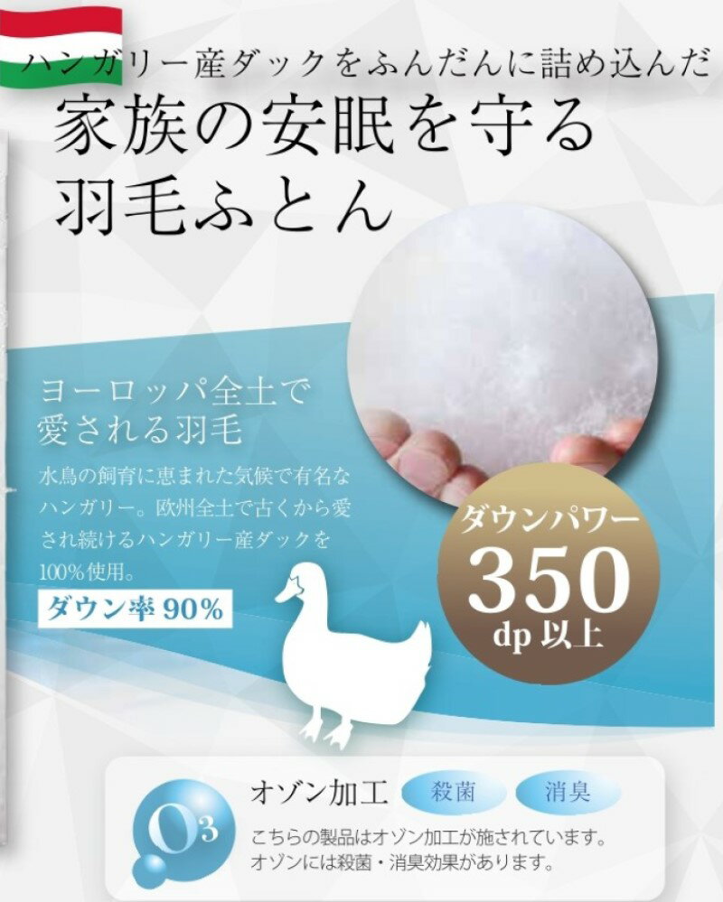 【特徴】 1.軽く、保温性・かさ高性に優れるハンガリー産ホワイトダックダウン 90%使用 2. 1年通して御利用頂ける2枚合わせのオールシーズンタイプ。
