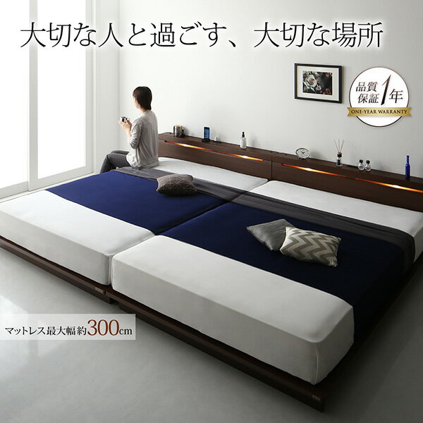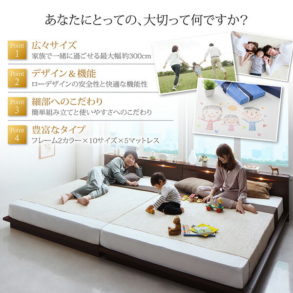 ローベッド/大型ベッド/ファミリーベッド/家族/夫婦/マットレスセット/マットレス付き/棚付き/ライト付き/照明付き/コンセント付き